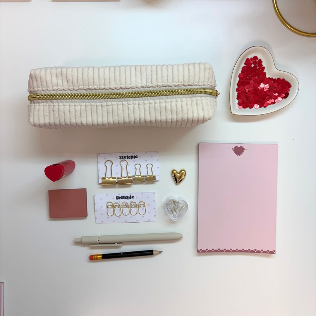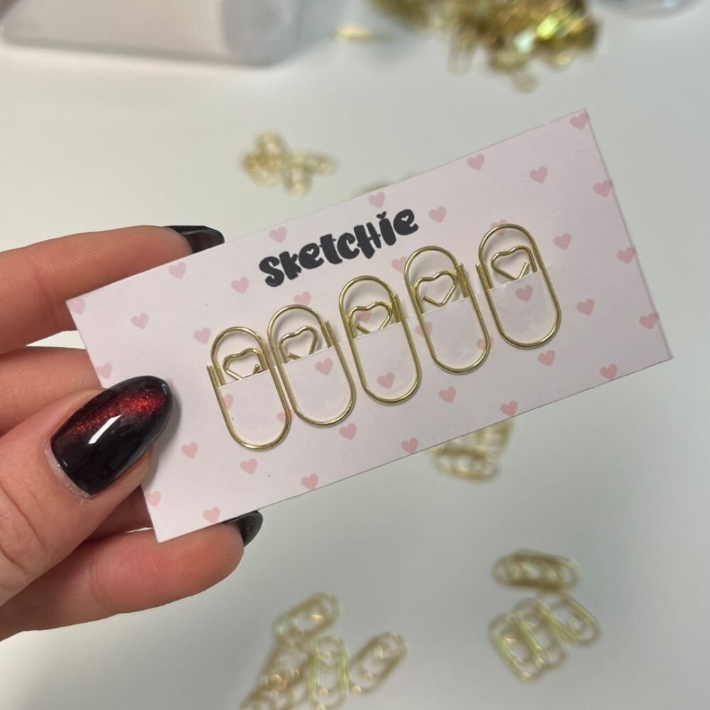 5 אטבים | 4 קליפסים בשני גדלים | מחק לב (צבע משתנה) | מיני עיפרון | מיני פוסט-איט (צבע משתנה) | מגנט לב זהב | קופסת לב עם 5 נעצים